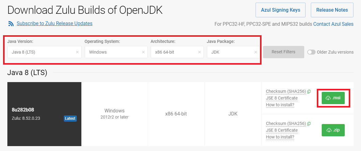 2. 홈페이지에 들어가서 아래쪽을 살펴보면 Download Zulu Builds of openJDK가 보인다. 필터를 이용하여 본인의 환경에 맞는 파일을 쉽게 찾을 수 있다.