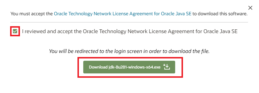 3. 클릭하면 아래와 같은 창이 뜨는데 체크박스에 체크를 하고 다운로드 버튼을 누르면 오라클 로그인 페이지로 이동된다. 로그인을 하면 자동으로 다운로드가 실행된다.
