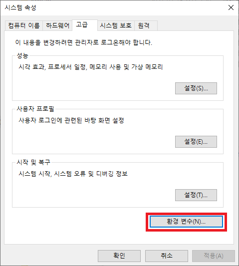 2. 고급 탭의 환경 변수를 클릭한다.