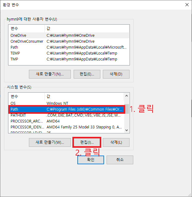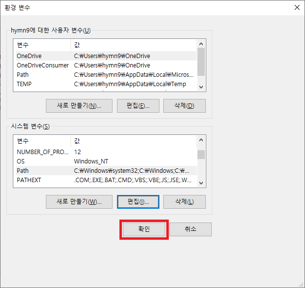 5. JAVA_HOME변수를 추가했다면 Path변수를 클릭하고 편집을 누른다.