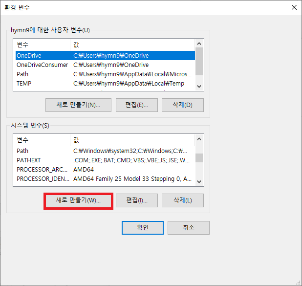 (시스템 변수에 새로 만들기가 안보인다? → 1번 과정에서 계정의 환경 변수 편집을 잘 못 눌러서 들어온 것)