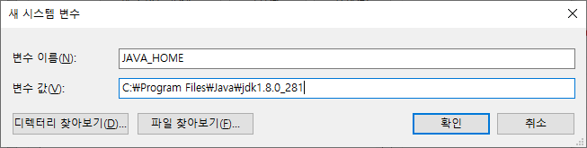4. cmd에서 사용할 메인 자바 경로를 지정하기 위해서 JAVA_HOME 변수를 생성하고 본인이 설치한 JDK경로를 변수 값에 입력하면 된다. (아래 사진은 오라클에서 다운로드 받은 자바의 경로를 넣은 것)