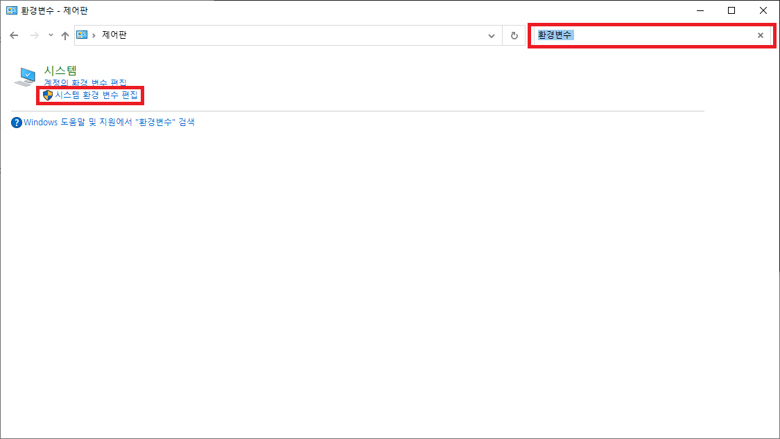 1. 제어판에서 환경변수를 검색하여 시스템 환경 변수 편집을 클릭한다.
