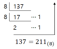 1) 10진수를 변환하고자 하는 진법의 기수로 나누고, 나머지를 기록한다.