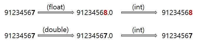 예를 들어 int의 최댓값은 약 20억으로 최대 10자리의 정밀도를 요구하는데 float은 10진수로 약 7자리의 정밀도를 제공하여 정밀도 차이에 의한 오차가 발생할 수 있다. 그래서 10진수로 8자리 이상의 값을 실수형으로 변환할 때는 float가 아닌 double(15자리 정밀도)로 형변환해야 오차가 발생하지 않을 것이다.
