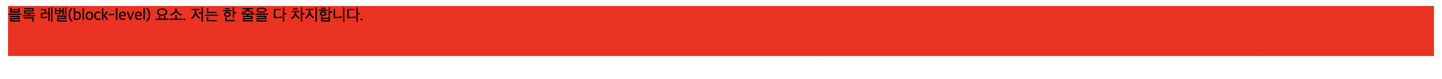 태그를 사용해 요소를 삽입했을 때 혼자서 한줄(width 100%)을 차지하는 요소이다. 해당 요소의 좌, 우측에는 다른 요소가 올 수 없으며 새로운 라인을 추가한다. 너비, 마진, 패딩 등을 이용하여 크기나 위치를 지정하려면 블록 레벨 요소여야 한다.
