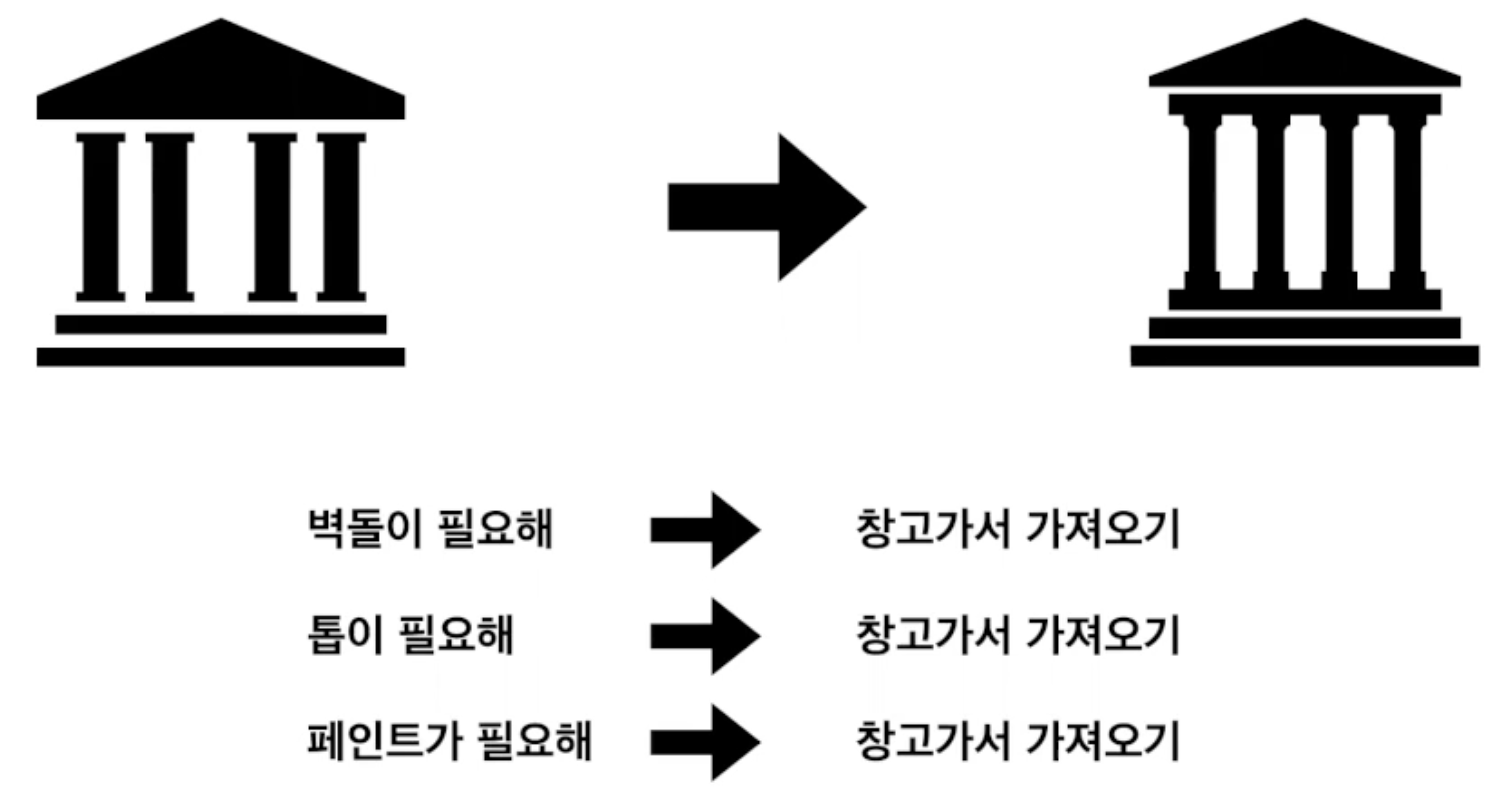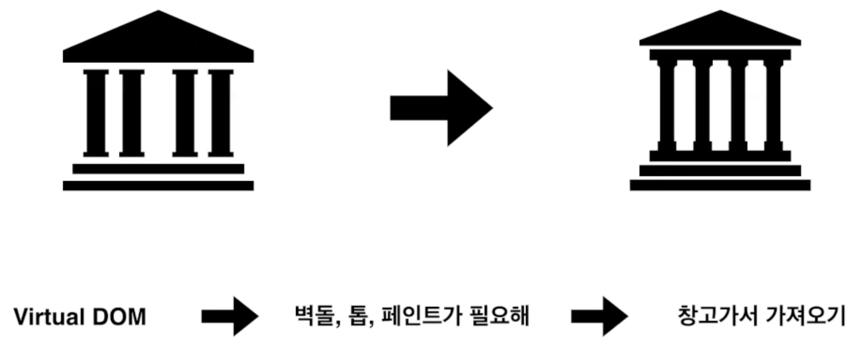 예시로 좌측의 경우는 필요할 때마다 요청을해서 창고를 3번이나 가는 비효율적인 상황이고, 우측의 경우는 Virtual DOM이 계산을 하고 정리된 요청을 하여 창고를 한 번만 가는 경우이다.