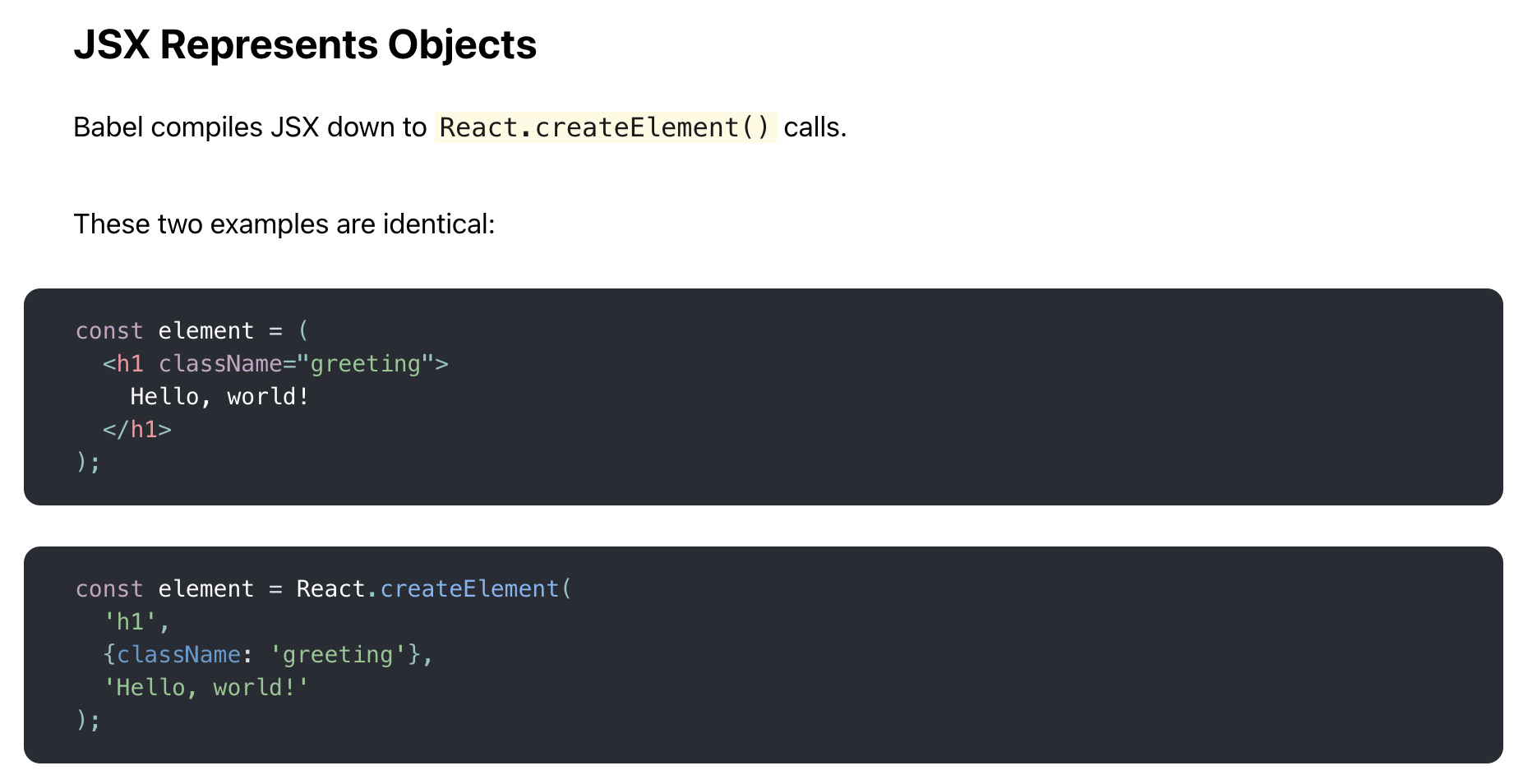 컴파일이 끝나면, JSX 표현식이 정규 JavaScript 함수 호출이 되고 JavaScript 객체로 인식된다. JSX를 if 구문 및 for loop 안에 사용하고, 변수에 할당하고, 인자로서 받아들이고, 함수로부터 반환할 수 있다.