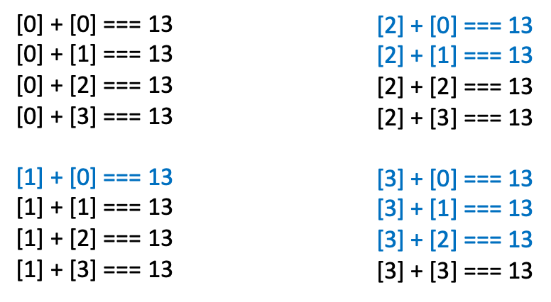 예시) nums는 [4, 9, 11, 14]이며, target은 13이다. nums[0] + nums[1] = 4 + 9 = 13이다. 그러면 return 값으로 [0, 1]이 되야 한다.
