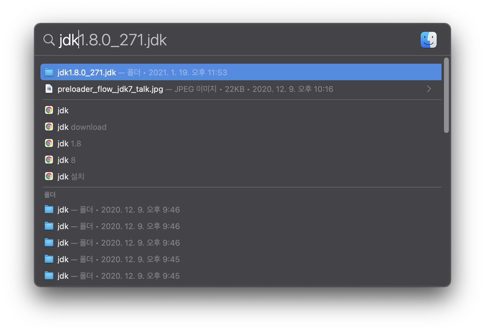 참고) 본인의 JDK설치 위치를 못 찾겠다면 키보드의 [command] + [space]를 눌러서 Spotlight 기능으로 jdk를 검색하면 금방 찾을 수 있다. 그리고 절대경로를 잘 모르겠거나 편하게 위 명령어를 입력하고 싶다면, 터미널에 cd 입력 후 한 칸 띄우고 bin폴더를 드래그하여 터미널 안에 넣으면 위 문장을 완성할 수 있다.