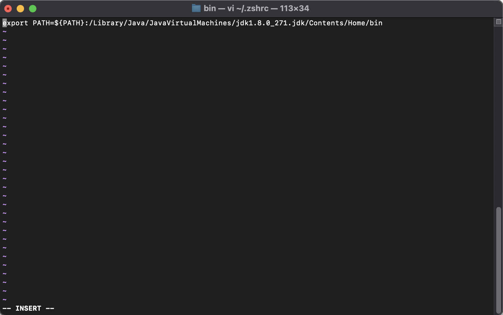 위 명령어를 통해서 zshrc창이 실행되면 "i"키(insert mode 편집모드 진입)를 누른 후 환경변수를 등록하는 명령어를 입력한다.