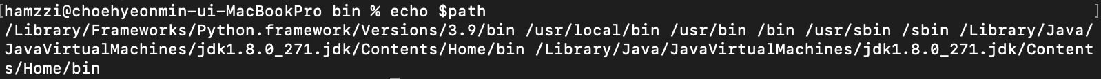 환경변수들의 경로인 path를 출력하는 명령어 'echo $path'를 통해서 본인이 입력한 JDK경로가 무사히 나온 것을 확인할 수 있다.