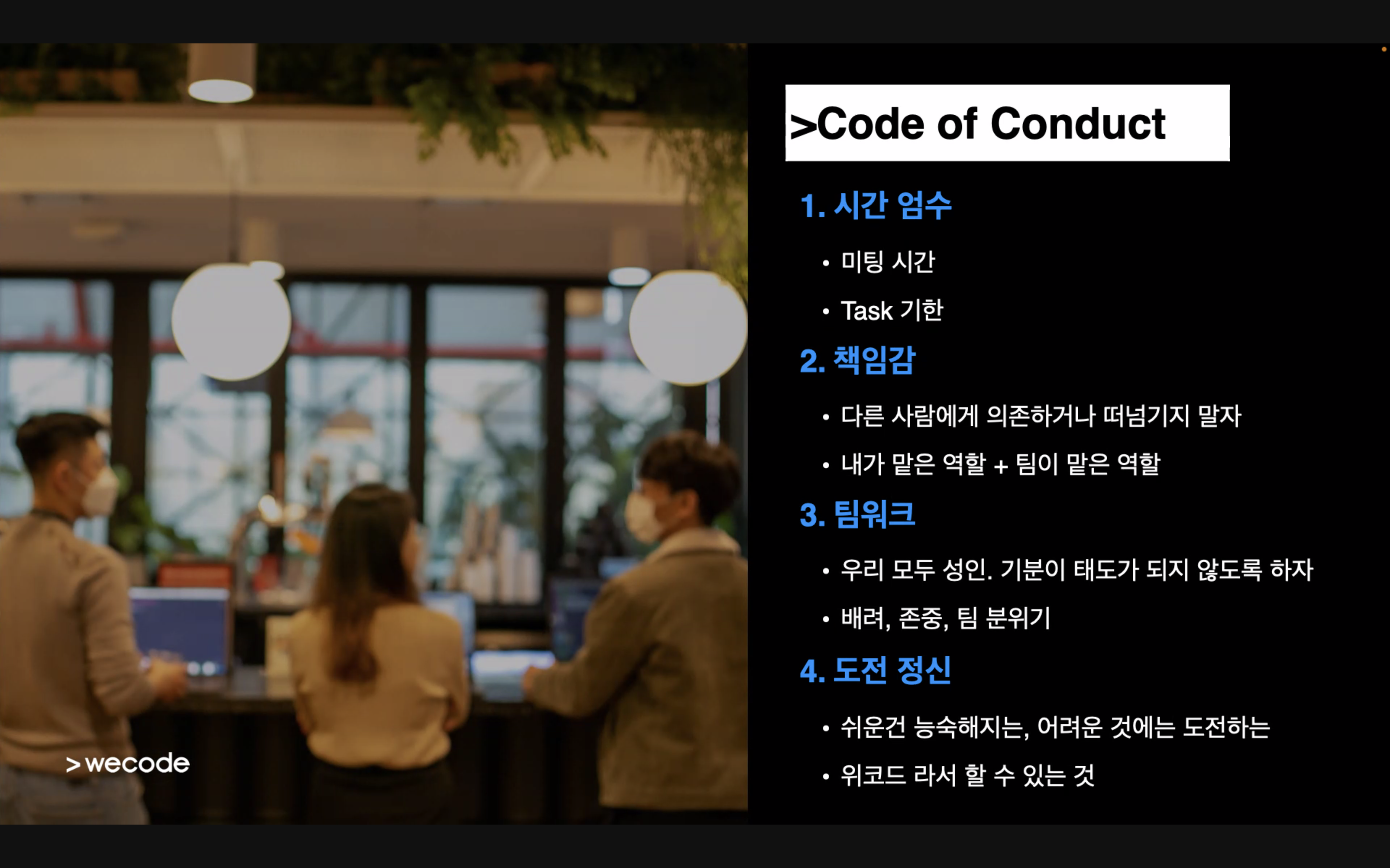 위코드 커리큘럼 'Foundation -2'가 끝났다. 4주 차 마지막 날에 바로 옆 방에서 1, 2차 프로젝트를 진행하며 같은 층을 사용하던 32기가 기업 협업에 들어가면서 짐을 비웠다. 빈자리에는 기업 협업을 끝낸 31기가 그 자리에서 수료식을 진행하고 있었다. 수료식을 진행하는 31기들의 얼굴을 보았는데 다들 표정이 밝았다. 그 모습을 보고 지난 한 달 동안 후회가 남지 않도록 열심히 했는지, 이대로라면 나도 수료식 때 밝은 표정으로 마무리를 할 수 있을지 생각하게 되었다. 다음 주면 빈 방에는 34기가 들어오게 되면서 33기는 기대되는 1차 프로젝트를 진행하게 된다.