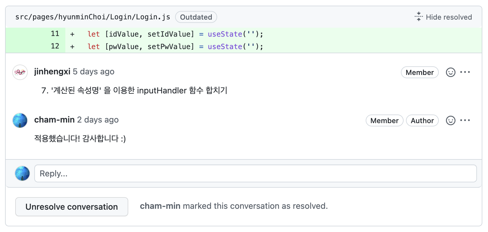 이런 식으로 Github에 해당 코드에 어떤 문제점이 있는지 이야기를 해주면, 어떤 문제가 있는지 생각해보고 수정하는 시간을 가졌다. 위 코멘트는 input 태그에는 name이라는 속성이 있는데 이를 활용하여 여러 개의 input handler를 하나로 합치라는 의미이다.