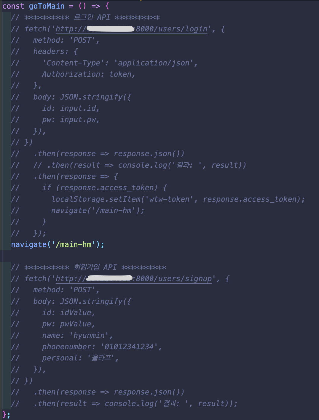 기존 로그인 버튼을 누르면 작동되는 goToMain 함수에 백엔드 API를 연결했다. 회원가입부터 하는데 백엔드에서 회원가입에 필요한 정보로 id, pw, name, phonenumber, personal 정보를 넘겨야 가입이 진행된다고 했다. 하지만 회원가입을 따로 백엔드와 맞춰서 구현해놓은 상황이 아니었기에 id, pw만 우리가 웹에서 입력한 정보를 넘기고, 나머지는 정적인 값을 넘겼다.