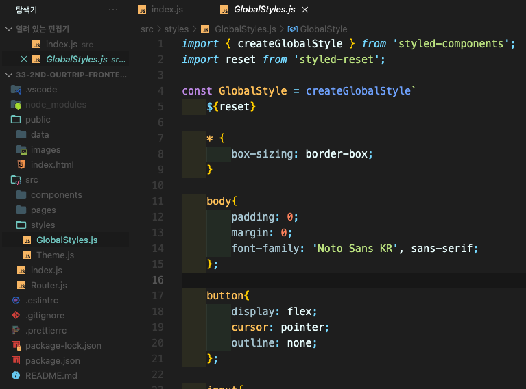 이후에 GlobalStyles.js를 사용하기 위해서 index.js에 아래와 같이 작성했다. import GlobalStyle from './styles/GlobalStyles';를 작성하고 <GlobalStyle />컴포넌트를 사용했다.