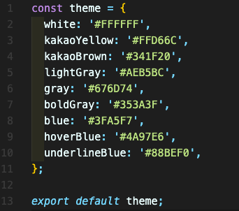 추가로 src > styles 디렉토리 내에 Theme.js 파일을 생성하여 아래와 같은 코드를 작성했고, 마찬가지로 index.js에서 import하여 <ThemeProvider theme={theme}>로 사용했다.