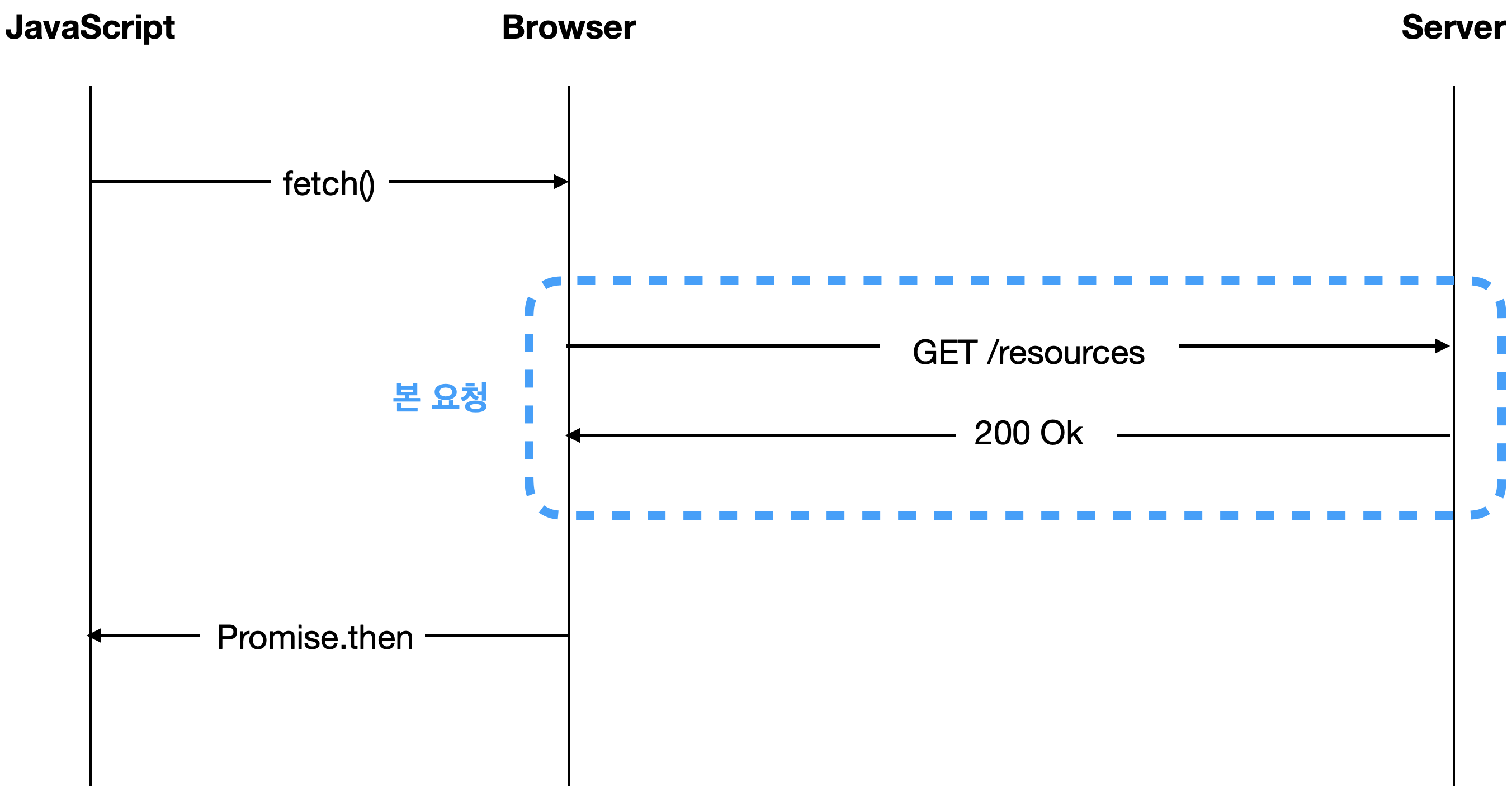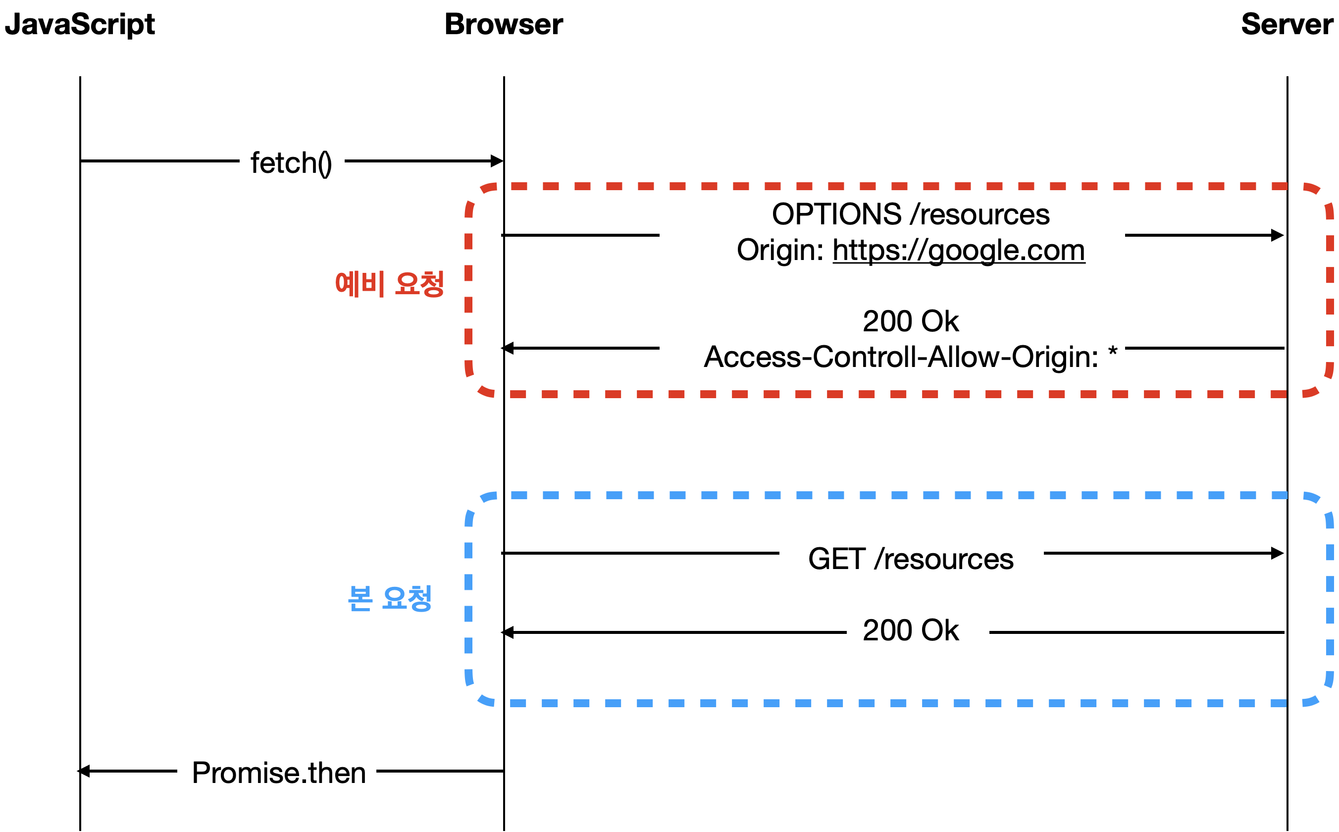 fetch API를 사용하여 브라우저에게 리소스를 받아오는 명령을 내리면 브라우저는 서버에게 예비 요청을 먼저 보낸다. 서버는 예비 요청 응답으로 현재 어떤 것을 허용하고, 어떤 것을 금지하고 있는지에 대한 정보를 응답 헤더에 담아서 브라우저에게 다시 보내준다.