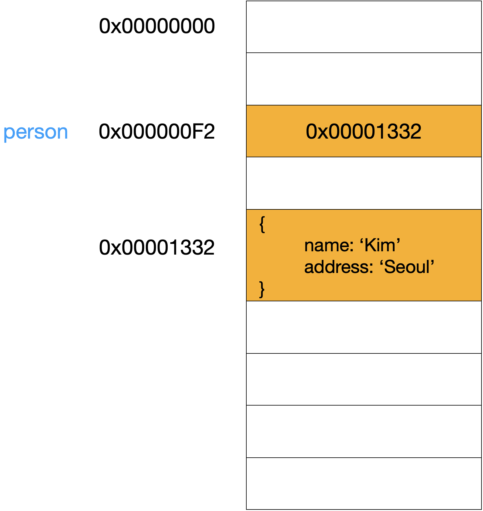 따라서 메모리를 효율적으로 사용하기 위해서 객체를 복사해 생성하는 비용을 절약하여 성능을 향상시키기 위해서 객체는 변경 가능한 값으로 설계되어 있다. 위와 같은 구조에 따른 부작용으로 원시값과 다르게 여러 개의 식별자가 하나의 객체를 공유할 수 있다.