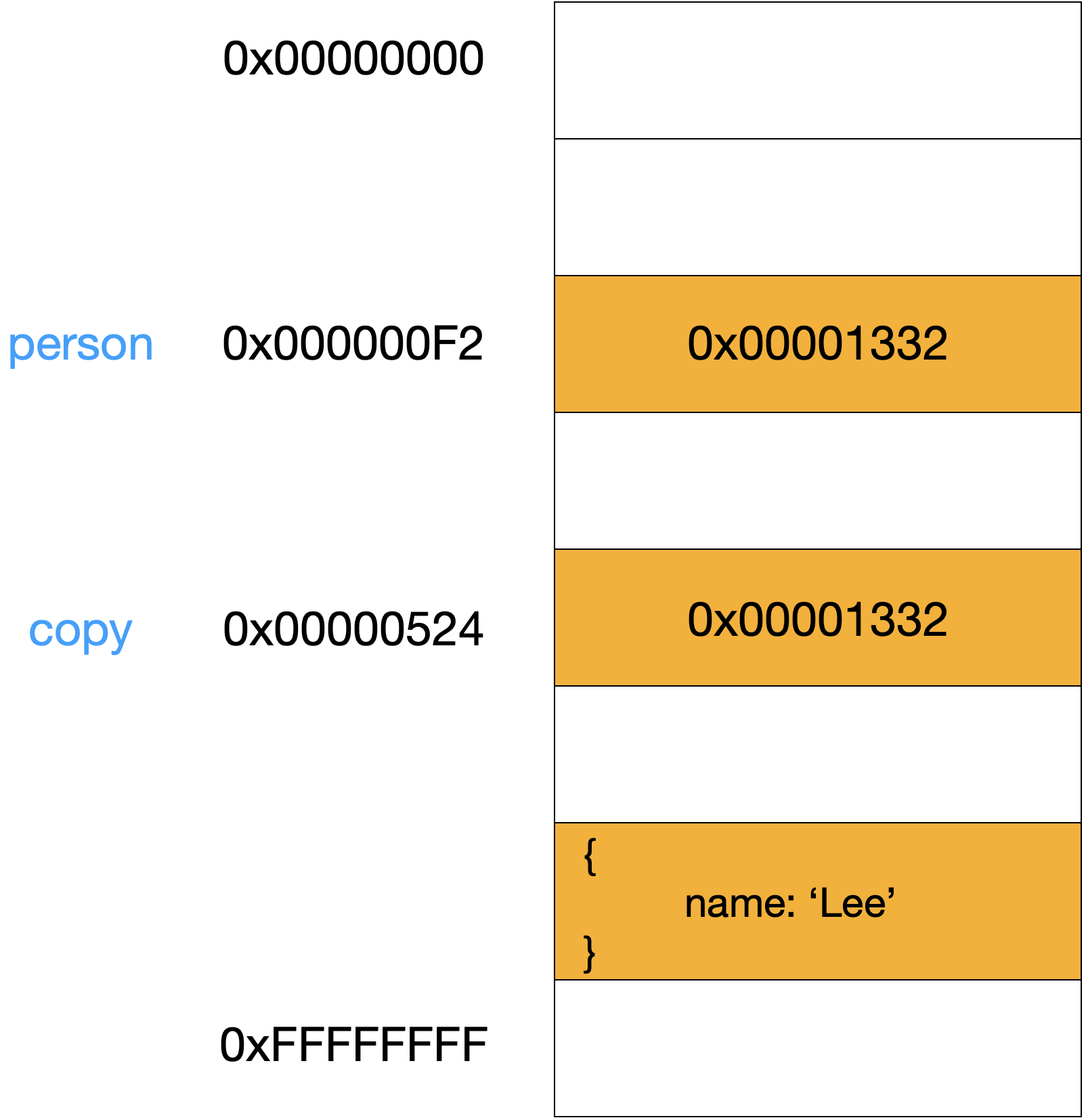 - 참조에 의한 전달 : 객체를 가리키는 변수(원본, person)를 다른 변수(사본, copy)에 할당하면 원본의 참조 값이 복사되어 잔달된다.